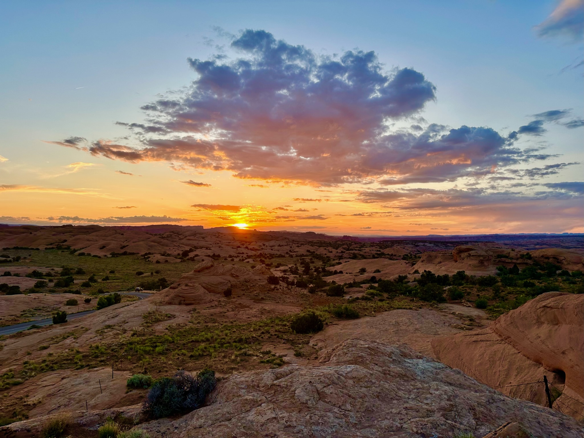 A great spot to catch the sunset in Moab is located outside town on the rocks overlooking the Slickrock trails. Although it may not have been considered a spectacular sunset by some, it’s a lovely spot to relax with a beer, enjoy the sunset, and chat about our upcoming plans for the morning.